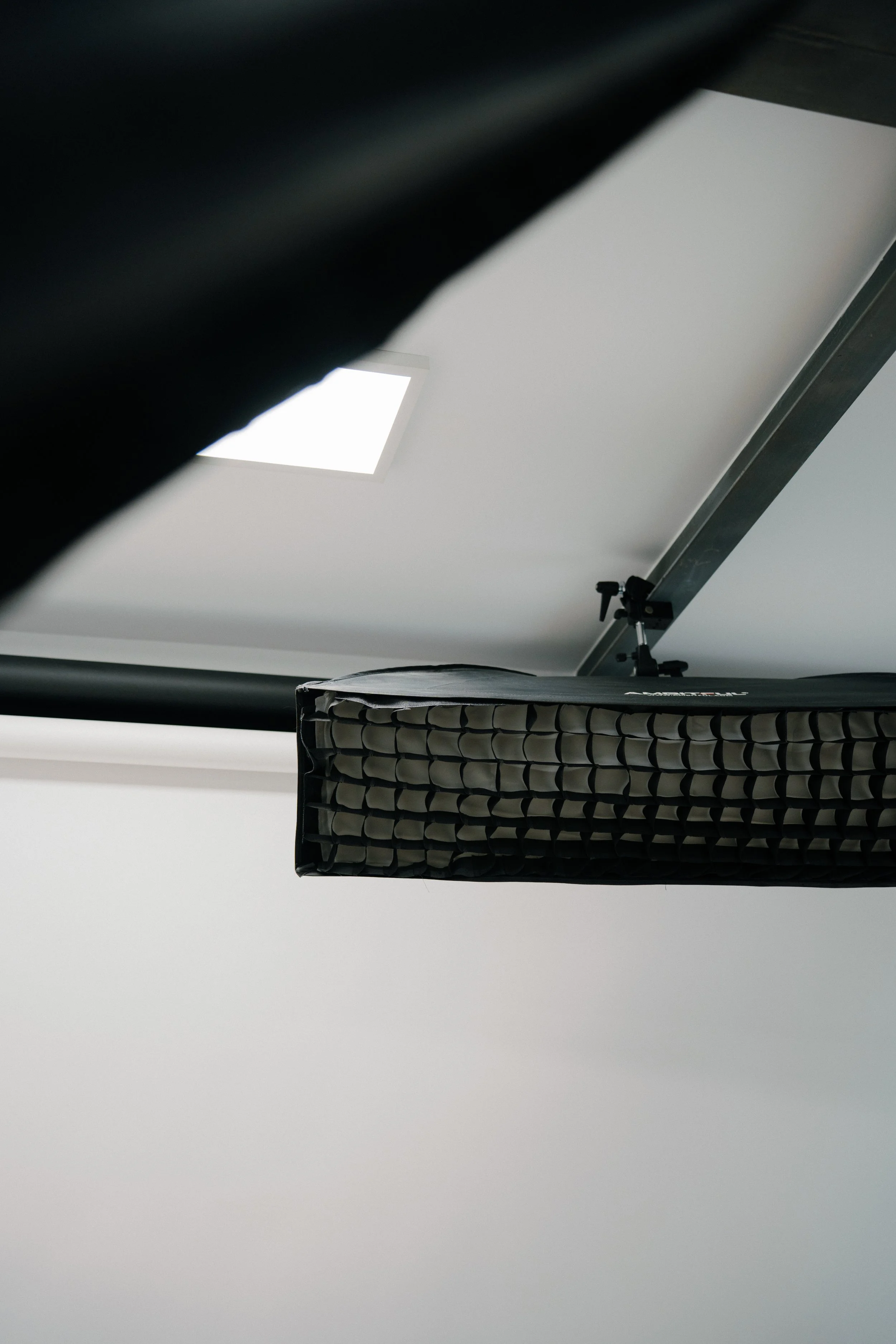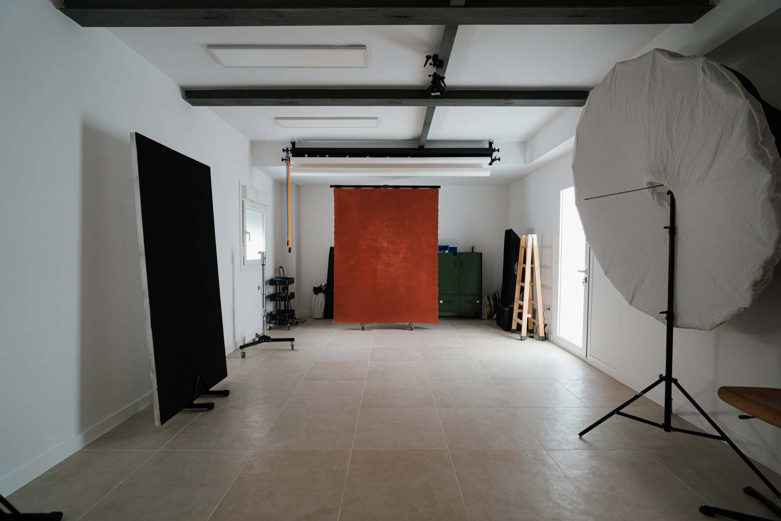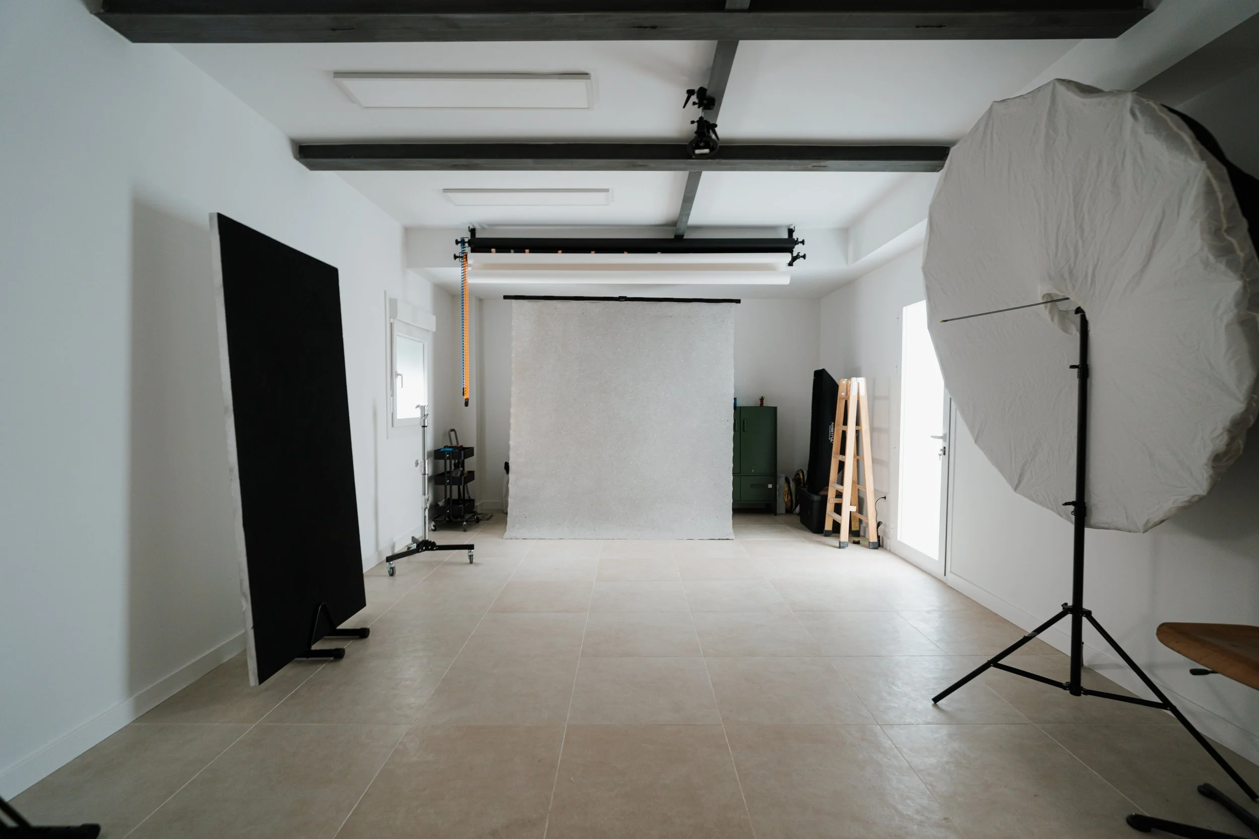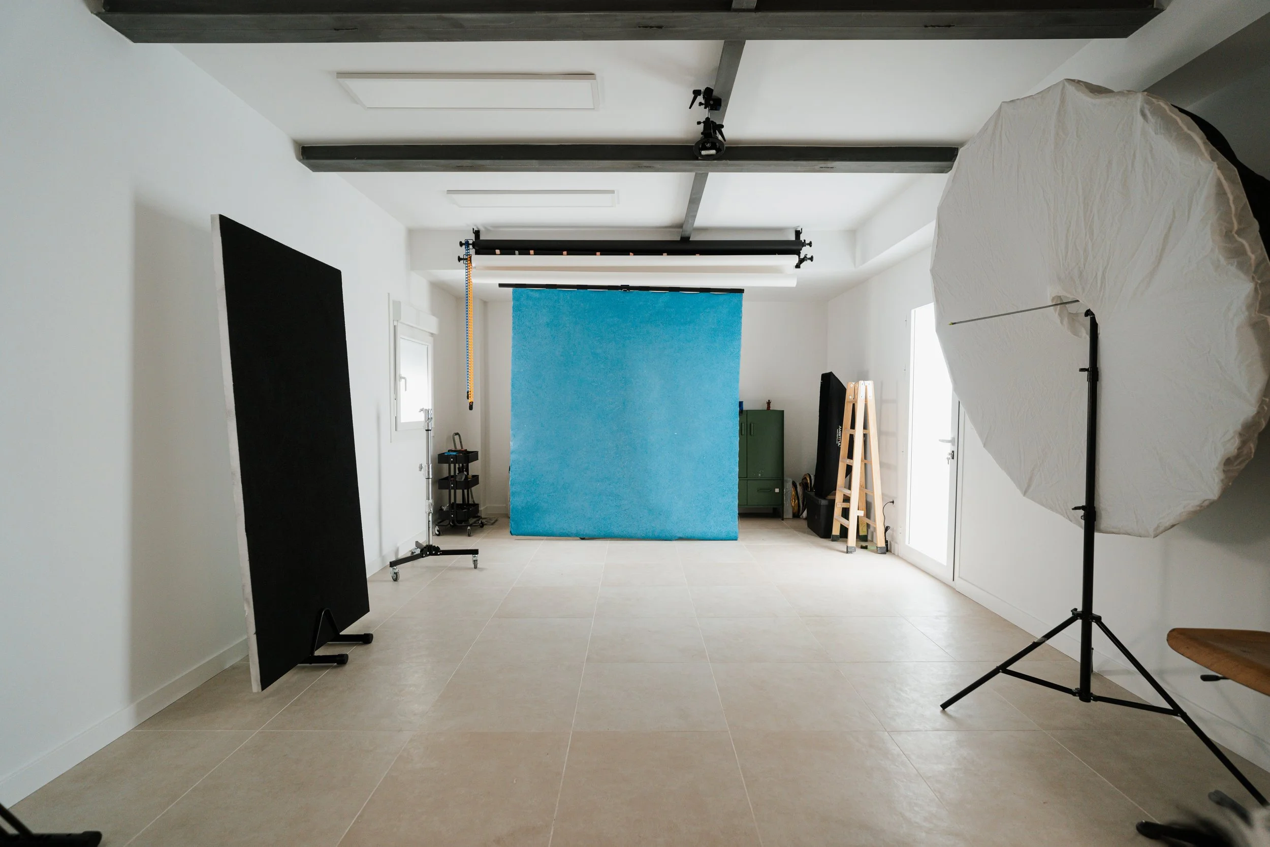 El estudio permite trabajar con luz natural controlada o crear una caja negra completa para dominar la iluminación. Equipado con flash y luz continua profesional, sistema de fondos y anclajes en techo para configuraciones versátiles.